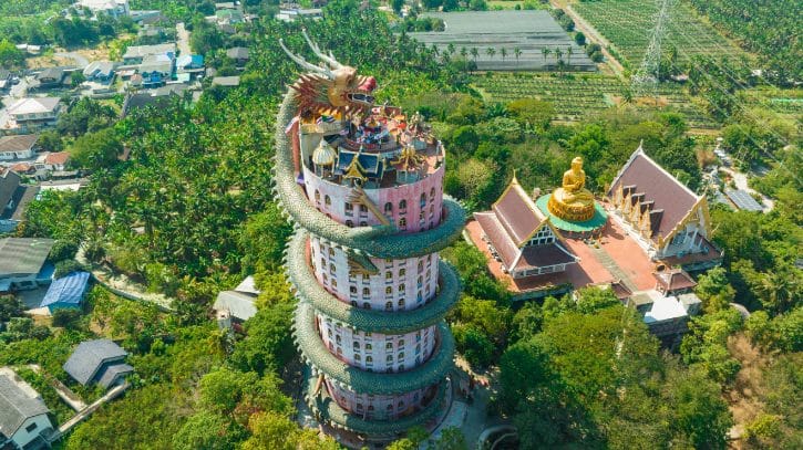 The architecture blends Thai and Chinese styles, and there’s a cave at the base worth exploring.