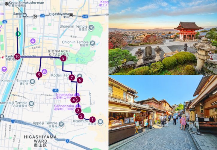 This route connects Kyoto’s most iconic sights into one perfect day on foot, from a clifftop temple at sunrise to lantern-lit riverside dining after dark. Check out the route below. 😊