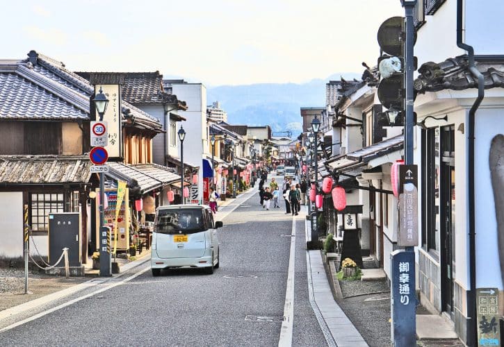 Mamedamachi in Hita City deserves special attention. This preserved Edo-period merchant quarter has earned the nickname “Little Kyoto of Kyushu”. Rows of white-walled kura storehouses, traditional merchant houses, and old sake breweries line the streets.